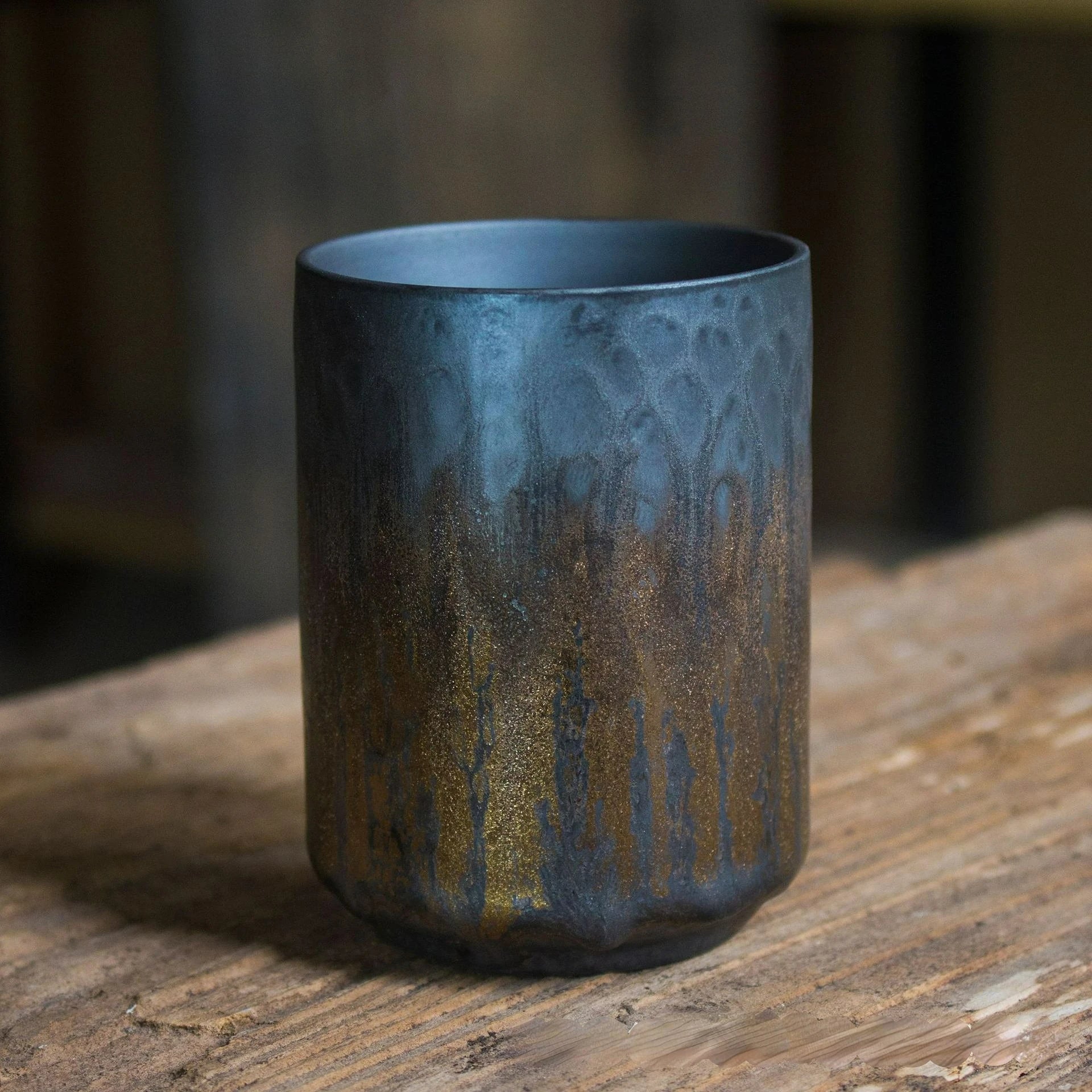 Design: The teacup's iron glaze is thoughtfully applied, resulting in a lustrous, reflective sheen that contrasts with the textured pottery, while the hand-applied flower gilding adds a touch of understated elegance.